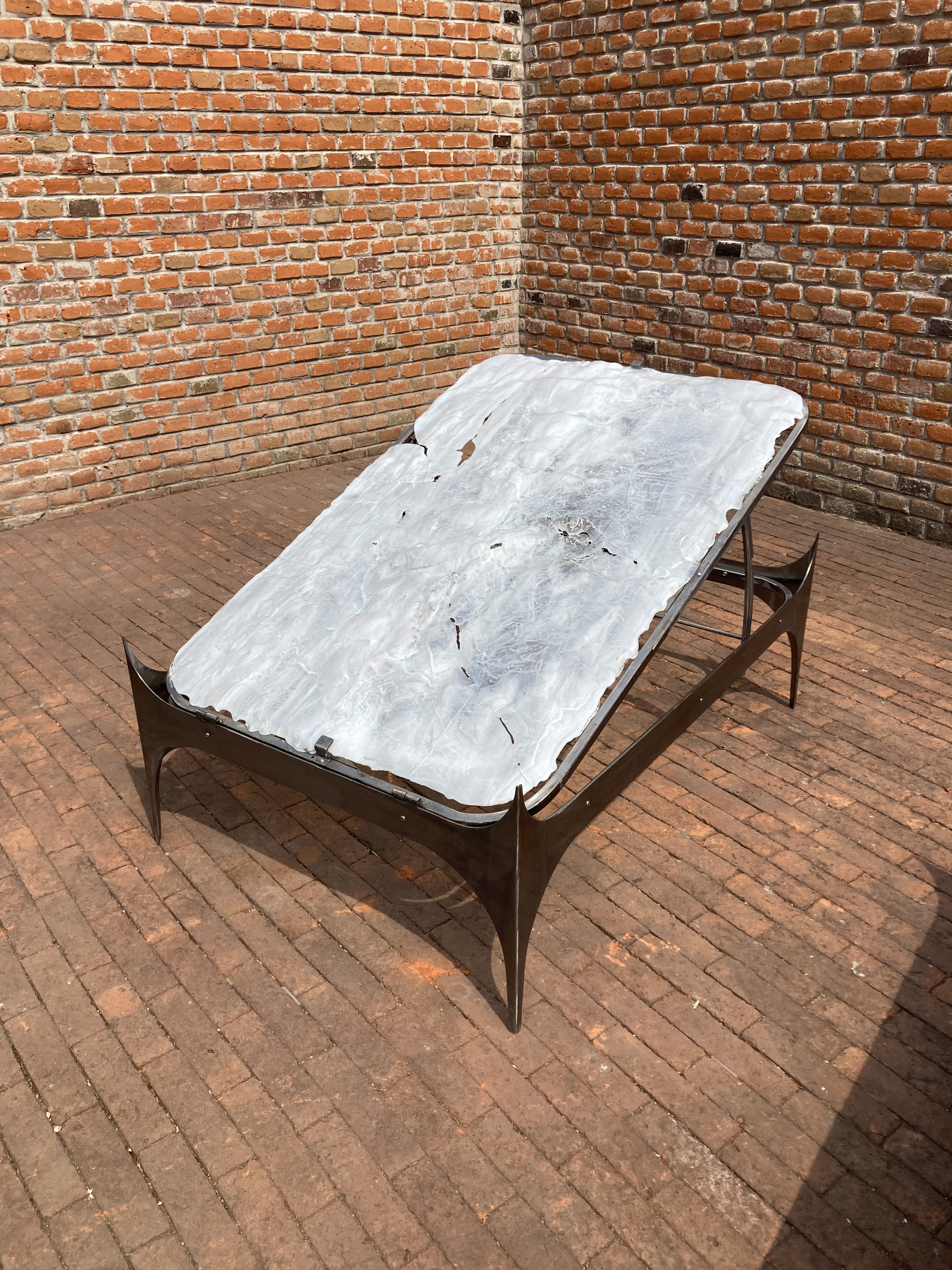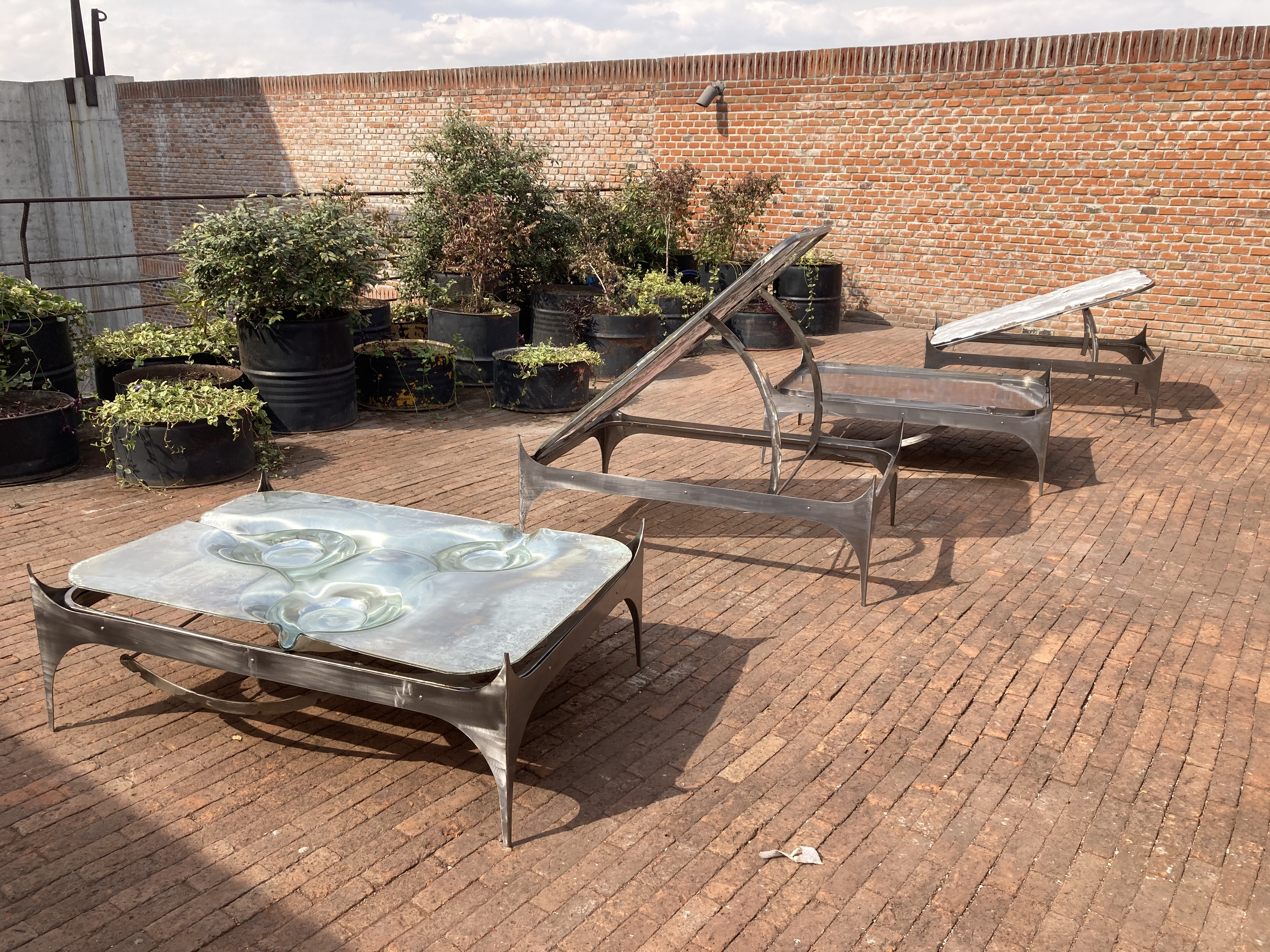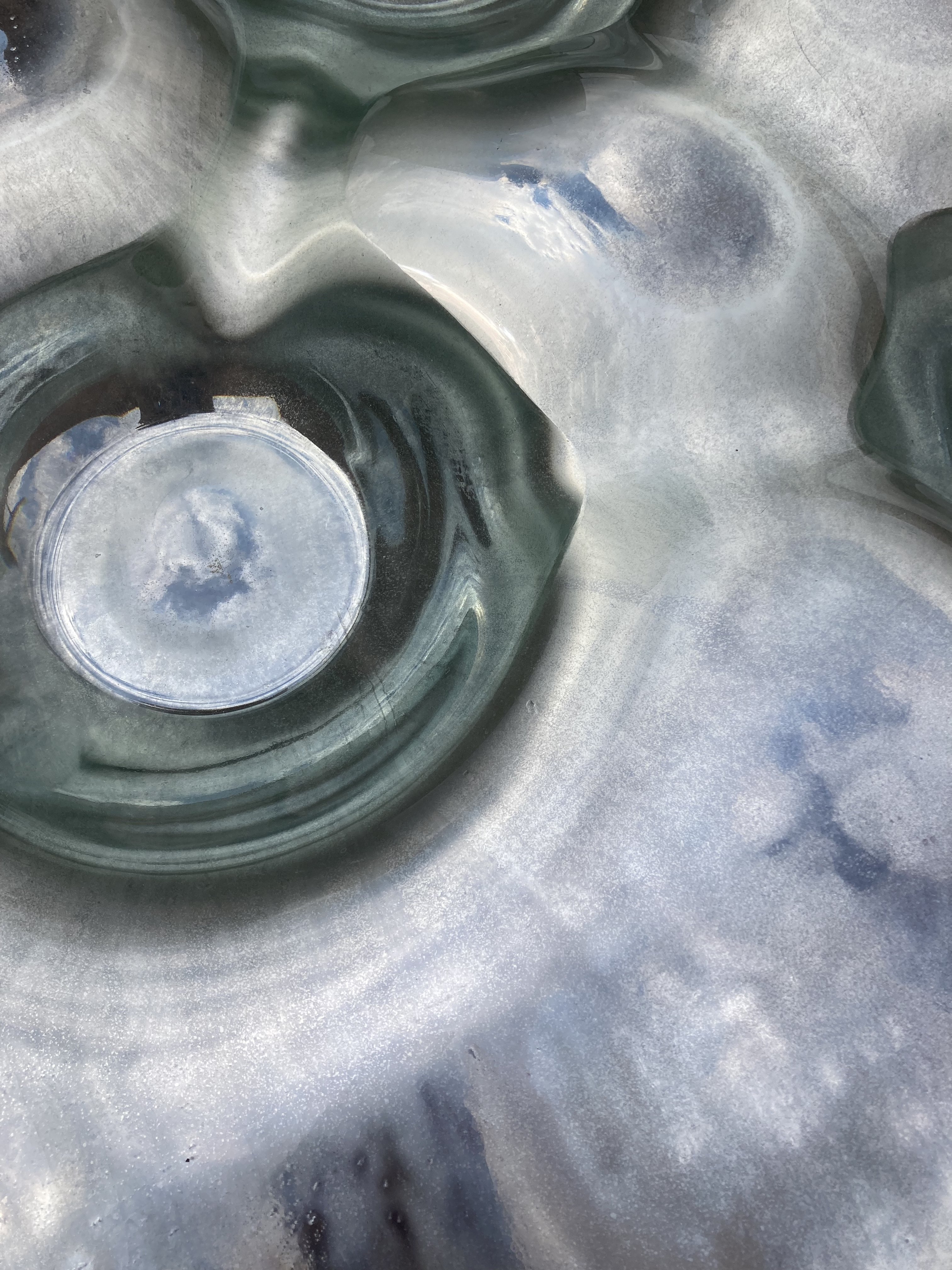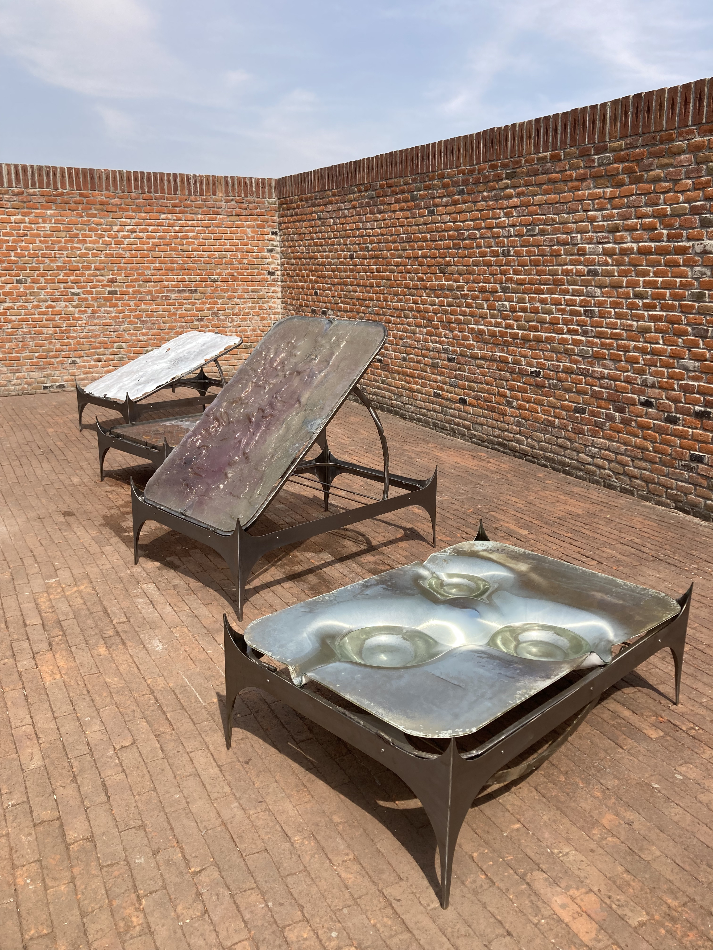Cuatro piezas nos reciben en la terraza. Su apariencia extraña, nos invita a acercarnos y detenernos en su contemplación preguntándonos qué es ese material de cualidades inciertas: una especie de líquido solidificado cuyas texturas, colores y reflejos podrían remitirnos a paisajes diversos o imaginarios; o quizá simplemente nos convocan a rendirnos ante lo desconocido y apreciar su materialidad mas allá de la búsqueda de entendimiento.